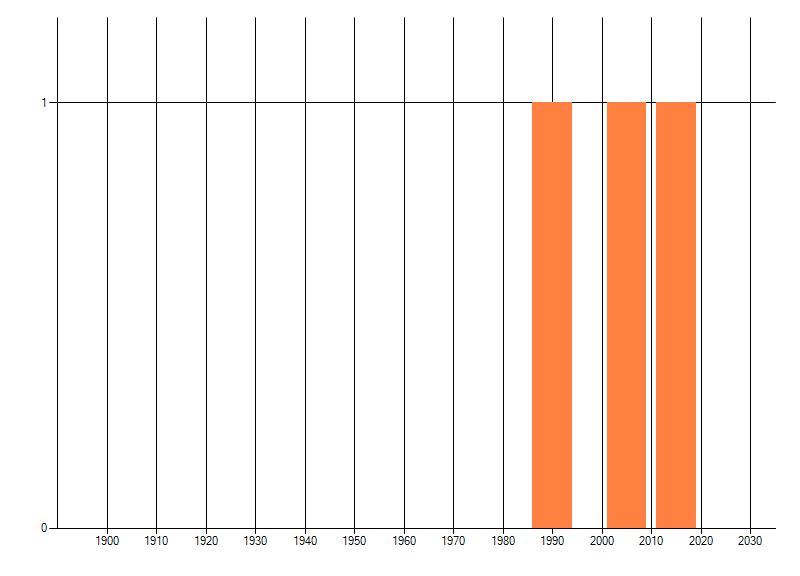Het aantal atlasblokken (5x5 km) waarin de soort is gemeld binnen een periode van vijf jaar (vanaf 1980) of twintig jaar. Niet gecorrigeerd voor waarnemersinspanning en het aantal doorgegeven waarnemingen kan sterk variëren per periode, dus een trend in verspreiding kan hier niet direct uit worden afgelezen. Het opgegeven jaartal is het eerste jaar van de periode. Bron: gevalideerde waarnemingen uit de NDFF.