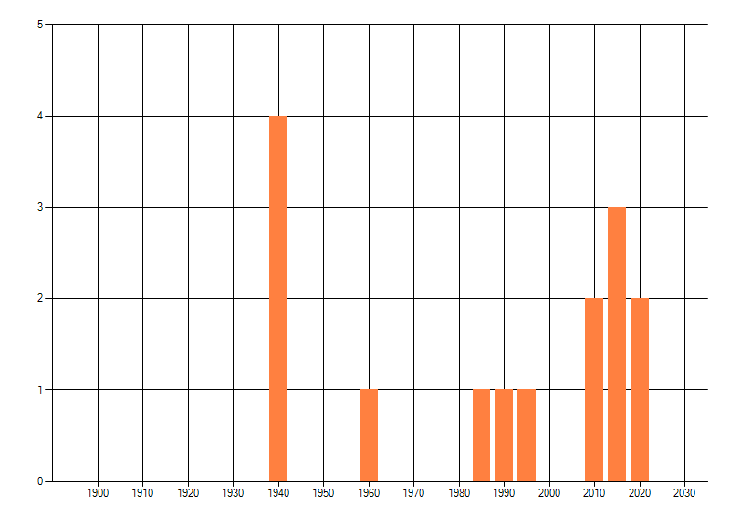 Het aantal atlasblokken (5x5 km) waarin de soort is gemeld binnen een periode van vijf jaar (vanaf 1980) of twintig jaar. Niet gecorrigeerd voor waarnemersinspanning en het aantal doorgegeven waarnemingen kan sterk variëren per periode, dus een trend in verspreiding kan hier niet direct uit worden afgelezen. Het opgegeven jaartal is het eerste jaar van de periode. Bron: gevalideerde waarnemingen uit de NDFF.