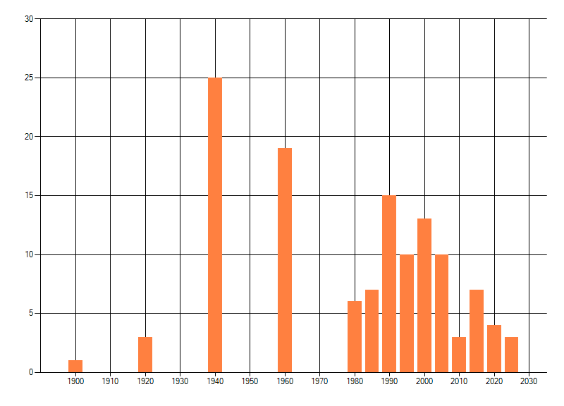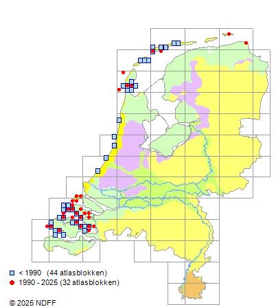 Het aantal atlasblokken (5x5 km) waarin de soort is gemeld binnen een periode van vijf jaar (vanaf 1980) of twintig jaar. Niet gecorrigeerd voor waarnemersinspanning en het aantal doorgegeven waarnemingen kan sterk variëren per periode, dus een trend in verspreiding kan hier niet direct uit worden afgelezen. Het opgegeven jaartal is het eerste jaar van de periode. Bron: gevalideerde waarnemingen uit de NDFF.