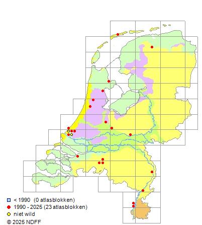 Het aantal atlasblokken (5x5 km) waarin de soort is gemeld binnen een periode van vijf jaar (vanaf 1980) of twintig jaar. Niet gecorrigeerd voor waarnemersinspanning en het aantal doorgegeven waarnemingen kan sterk variëren per periode, dus een trend in verspreiding kan hier niet direct uit worden afgelezen. Het opgegeven jaartal is het eerste jaar van de periode. Bron: gevalideerde waarnemingen uit de NDFF.