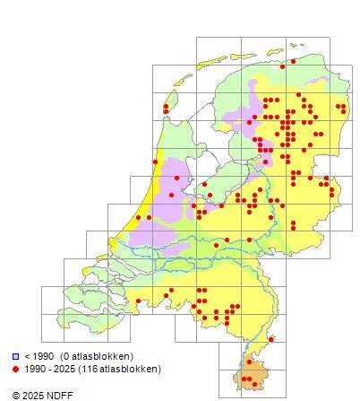 Het aantal atlasblokken (5x5 km) waarin de soort is gemeld binnen een periode van vijf jaar (vanaf 1980) of twintig jaar. Niet gecorrigeerd voor waarnemersinspanning en het aantal doorgegeven waarnemingen kan sterk variëren per periode, dus een trend in verspreiding kan hier niet direct uit worden afgelezen. Het opgegeven jaartal is het eerste jaar van de periode. Bron: gevalideerde waarnemingen uit de NDFF.