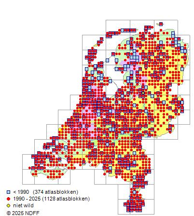 Het aantal atlasblokken (5x5 km) waarin de soort is gemeld binnen een periode van vijf jaar (vanaf 1980) of twintig jaar. Niet gecorrigeerd voor waarnemersinspanning en het aantal doorgegeven waarnemingen kan sterk variƫren per periode, dus een trend in verspreiding kan hier niet direct uit worden afgelezen. Het opgegeven jaartal is het eerste jaar van de periode. Bron: gevalideerde waarnemingen uit de NDFF.