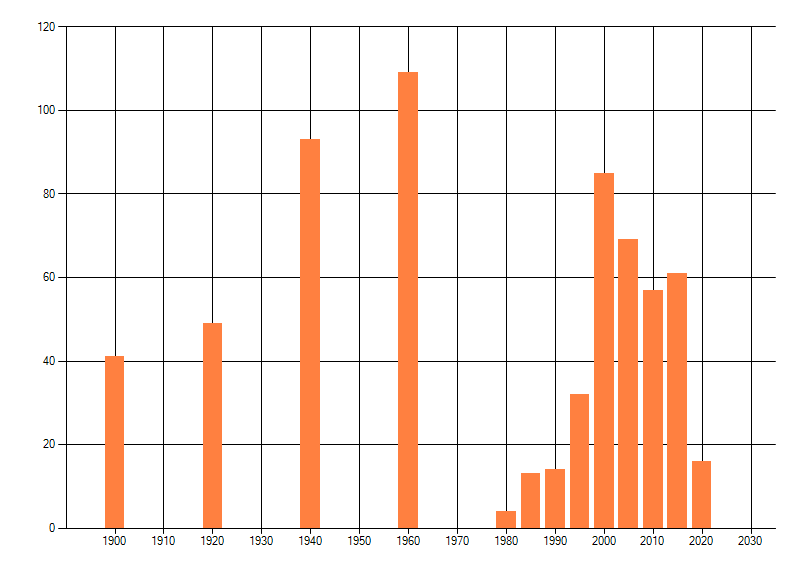 Het aantal atlasblokken (5x5 km) waarin de soort is gemeld binnen een periode van vijf jaar (vanaf 1980) of twintig jaar. Niet gecorrigeerd voor waarnemersinspanning en het aantal doorgegeven waarnemingen kan sterk variëren per periode, dus een trend in verspreiding kan hier niet direct uit worden afgelezen. Het opgegeven jaartal is het eerste jaar van de periode. Bron: gevalideerde waarnemingen uit de NDFF.