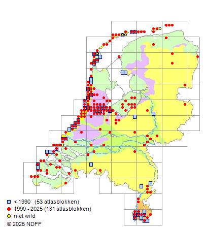 Het aantal atlasblokken (5x5 km) waarin de soort is gemeld binnen een periode van vijf jaar (vanaf 1980) of twintig jaar. Niet gecorrigeerd voor waarnemersinspanning en het aantal doorgegeven waarnemingen kan sterk variëren per periode, dus een trend in verspreiding kan hier niet direct uit worden afgelezen. Het opgegeven jaartal is het eerste jaar van de periode. Bron: gevalideerde waarnemingen uit de NDFF.