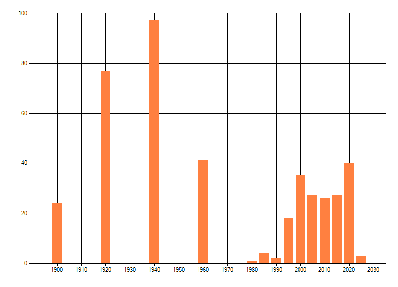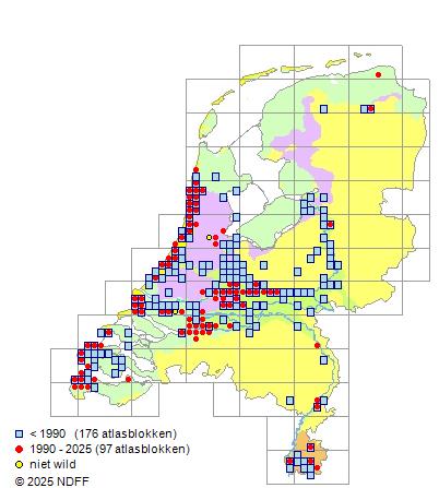 Het aantal atlasblokken (5x5 km) waarin de soort is gemeld binnen een periode van vijf jaar (vanaf 1980) of twintig jaar. Niet gecorrigeerd voor waarnemersinspanning en het aantal doorgegeven waarnemingen kan sterk variëren per periode, dus een trend in verspreiding kan hier niet direct uit worden afgelezen. Het opgegeven jaartal is het eerste jaar van de periode. Bron: gevalideerde waarnemingen uit de NDFF.