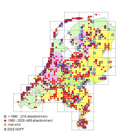 Het aantal atlasblokken (5x5 km) waarin de soort is gemeld binnen een periode van vijf jaar (vanaf 1980) of twintig jaar. Niet gecorrigeerd voor waarnemersinspanning en het aantal doorgegeven waarnemingen kan sterk variëren per periode, dus een trend in verspreiding kan hier niet direct uit worden afgelezen. Het opgegeven jaartal is het eerste jaar van de periode. Bron: gevalideerde waarnemingen uit de NDFF.