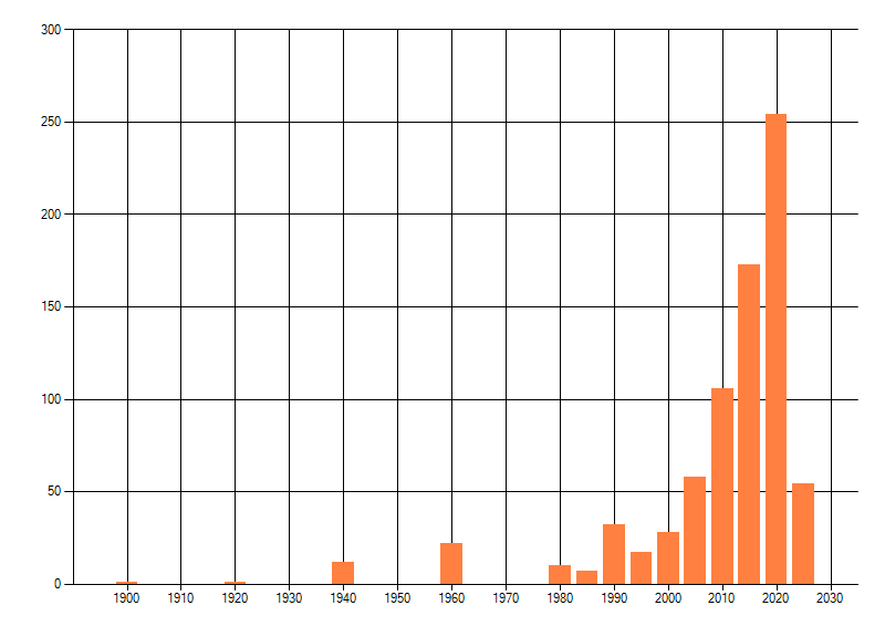 Het aantal atlasblokken (5x5 km) waarin de soort is gemeld binnen een periode van vijf jaar (vanaf 1980) of twintig jaar. Niet gecorrigeerd voor waarnemersinspanning en het aantal doorgegeven waarnemingen kan sterk variëren per periode, dus een trend in verspreiding kan hier niet direct uit worden afgelezen. Het opgegeven jaartal is het eerste jaar van de periode. Bron: gevalideerde waarnemingen uit de NDFF.