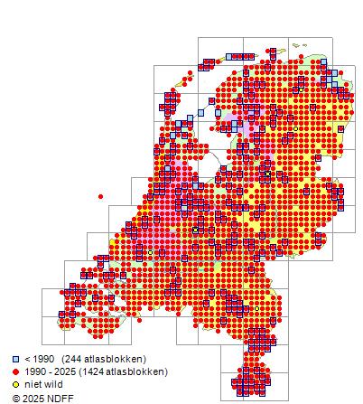 Het aantal atlasblokken (5x5 km) waarin de soort is gemeld binnen een periode van vijf jaar (vanaf 1980) of twintig jaar. Niet gecorrigeerd voor waarnemersinspanning en het aantal doorgegeven waarnemingen kan sterk variëren per periode, dus een trend in verspreiding kan hier niet direct uit worden afgelezen. Het opgegeven jaartal is het eerste jaar van de periode. Bron: gevalideerde waarnemingen uit de NDFF.