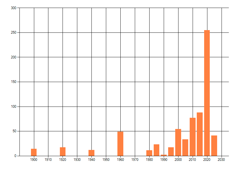 Het aantal atlasblokken (5x5 km) waarin de soort is gemeld binnen een periode van vijf jaar (vanaf 1980) of twintig jaar. Niet gecorrigeerd voor waarnemersinspanning en het aantal doorgegeven waarnemingen kan sterk variëren per periode, dus een trend in verspreiding kan hier niet direct uit worden afgelezen. Het opgegeven jaartal is het eerste jaar van de periode. Bron: gevalideerde waarnemingen uit de NDFF.