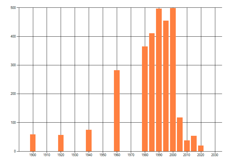 Het aantal atlasblokken (5x5 km) waarin de soort is gemeld binnen een periode van vijf jaar (vanaf 1980) of twintig jaar. Niet gecorrigeerd voor waarnemersinspanning en het aantal doorgegeven waarnemingen kan sterk variëren per periode, dus een trend in verspreiding kan hier niet direct uit worden afgelezen. Het opgegeven jaartal is het eerste jaar van de periode. Bron: gevalideerde waarnemingen uit de NDFF.
