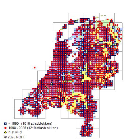 Het aantal atlasblokken (5x5 km) waarin de soort is gemeld binnen een periode van vijf jaar (vanaf 1980) of twintig jaar. Niet gecorrigeerd voor waarnemersinspanning en het aantal doorgegeven waarnemingen kan sterk variëren per periode, dus een trend in verspreiding kan hier niet direct uit worden afgelezen. Het opgegeven jaartal is het eerste jaar van de periode. Bron: gevalideerde waarnemingen uit de NDFF.