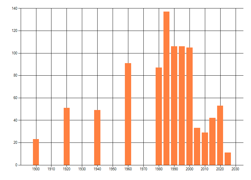 Het aantal atlasblokken (5x5 km) waarin de soort is gemeld binnen een periode van vijf jaar (vanaf 1980) of twintig jaar. Niet gecorrigeerd voor waarnemersinspanning en het aantal doorgegeven waarnemingen kan sterk variëren per periode, dus een trend in verspreiding kan hier niet direct uit worden afgelezen. Het opgegeven jaartal is het eerste jaar van de periode. Bron: gevalideerde waarnemingen uit de NDFF.