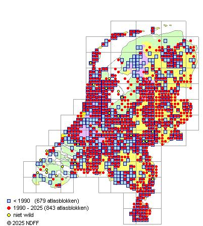 Het aantal atlasblokken (5x5 km) waarin de soort is gemeld binnen een periode van vijf jaar (vanaf 1980) of twintig jaar. Niet gecorrigeerd voor waarnemersinspanning en het aantal doorgegeven waarnemingen kan sterk variëren per periode, dus een trend in verspreiding kan hier niet direct uit worden afgelezen. Het opgegeven jaartal is het eerste jaar van de periode. Bron: gevalideerde waarnemingen uit de NDFF.