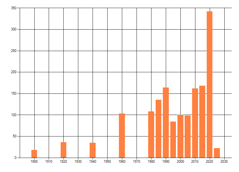 Het aantal atlasblokken (5x5 km) waarin de soort is gemeld binnen een periode van vijf jaar (vanaf 1980) of twintig jaar. Niet gecorrigeerd voor waarnemersinspanning en het aantal doorgegeven waarnemingen kan sterk variëren per periode, dus een trend in verspreiding kan hier niet direct uit worden afgelezen. Het opgegeven jaartal is het eerste jaar van de periode. Bron: gevalideerde waarnemingen uit de NDFF.