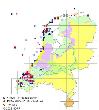 Het aantal atlasblokken (5x5 km) waarin de soort is gemeld binnen een periode van vijf jaar (vanaf 1980) of twintig jaar. Niet gecorrigeerd voor waarnemersinspanning en het aantal doorgegeven waarnemingen kan sterk variëren per periode, dus een trend in verspreiding kan hier niet direct uit worden afgelezen. Het opgegeven jaartal is het eerste jaar van de periode. Bron: gevalideerde waarnemingen uit de NDFF.