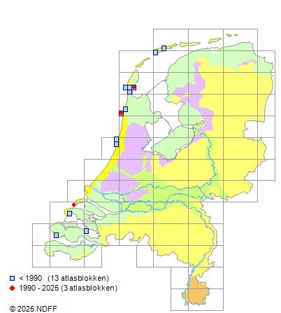 Het aantal atlasblokken (5x5 km) waarin de soort is gemeld binnen een periode van vijf jaar (vanaf 1980) of twintig jaar. Niet gecorrigeerd voor waarnemersinspanning en het aantal doorgegeven waarnemingen kan sterk variëren per periode, dus een trend in verspreiding kan hier niet direct uit worden afgelezen. Het opgegeven jaartal is het eerste jaar van de periode. Bron: gevalideerde waarnemingen uit de NDFF.