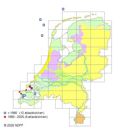 Het aantal atlasblokken (5x5 km) waarin de soort is gemeld binnen een periode van vijf jaar (vanaf 1980) of twintig jaar. Niet gecorrigeerd voor waarnemersinspanning en het aantal doorgegeven waarnemingen kan sterk variëren per periode, dus een trend in verspreiding kan hier niet direct uit worden afgelezen. Het opgegeven jaartal is het eerste jaar van de periode. Bron: gevalideerde waarnemingen uit de NDFF.