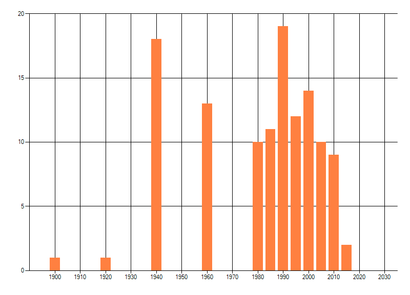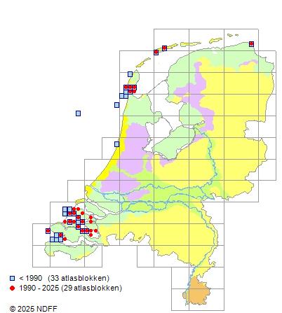 Het aantal atlasblokken (5x5 km) waarin de soort is gemeld binnen een periode van vijf jaar (vanaf 1980) of twintig jaar. Niet gecorrigeerd voor waarnemersinspanning en het aantal doorgegeven waarnemingen kan sterk variëren per periode, dus een trend in verspreiding kan hier niet direct uit worden afgelezen. Het opgegeven jaartal is het eerste jaar van de periode. Bron: gevalideerde waarnemingen uit de NDFF.