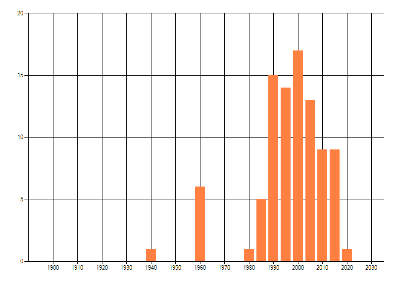 Het aantal atlasblokken (5x5 km) waarin de soort is gemeld binnen een periode van vijf jaar (vanaf 1980) of twintig jaar. Niet gecorrigeerd voor waarnemersinspanning en het aantal doorgegeven waarnemingen kan sterk variëren per periode, dus een trend in verspreiding kan hier niet direct uit worden afgelezen. Het opgegeven jaartal is het eerste jaar van de periode. Bron: gevalideerde waarnemingen uit de NDFF.
