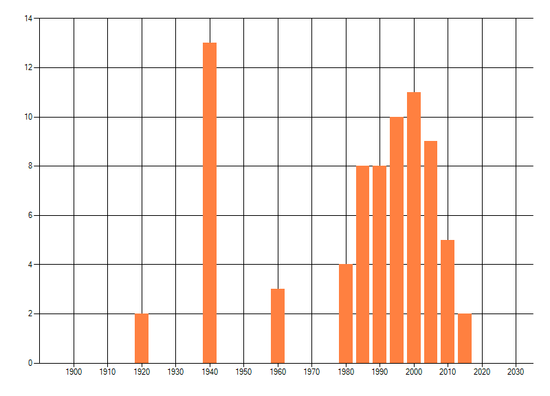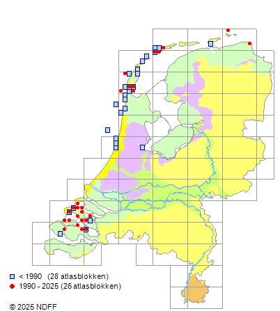 Het aantal atlasblokken (5x5 km) waarin de soort is gemeld binnen een periode van vijf jaar (vanaf 1980) of twintig jaar. Niet gecorrigeerd voor waarnemersinspanning en het aantal doorgegeven waarnemingen kan sterk variëren per periode, dus een trend in verspreiding kan hier niet direct uit worden afgelezen. Het opgegeven jaartal is het eerste jaar van de periode. Bron: gevalideerde waarnemingen uit de NDFF.
