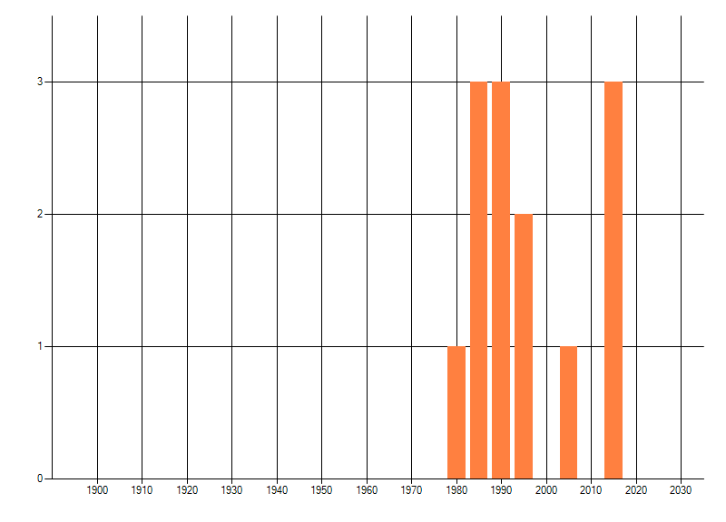 Het aantal atlasblokken (5x5 km) waarin de soort is gemeld binnen een periode van vijf jaar (vanaf 1980) of twintig jaar. Niet gecorrigeerd voor waarnemersinspanning en het aantal doorgegeven waarnemingen kan sterk variëren per periode, dus een trend in verspreiding kan hier niet direct uit worden afgelezen. Het opgegeven jaartal is het eerste jaar van de periode. Bron: gevalideerde waarnemingen uit de NDFF.