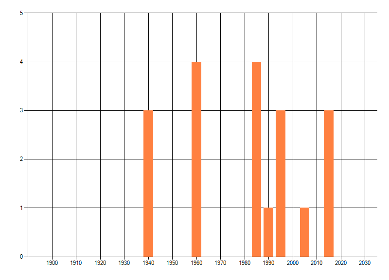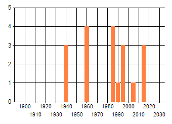Het aantal atlasblokken (5x5 km) waarin de soort is gemeld binnen een periode van vijf jaar (vanaf 1980) of twintig jaar. Niet gecorrigeerd voor waarnemersinspanning en het aantal doorgegeven waarnemingen kan sterk variëren per periode, dus een trend in verspreiding kan hier niet direct uit worden afgelezen. Het opgegeven jaartal is het eerste jaar van de periode. Bron: gevalideerde waarnemingen uit de NDFF.