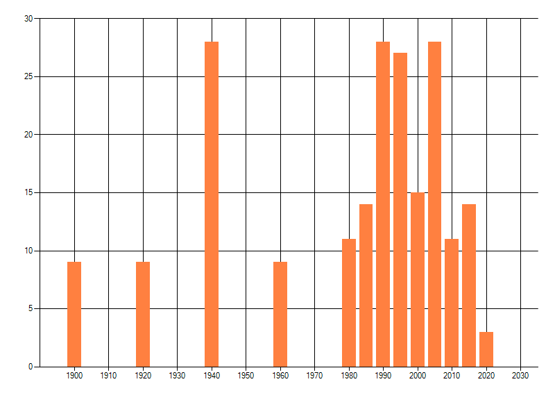 Het aantal atlasblokken (5x5 km) waarin de soort is gemeld binnen een periode van vijf jaar (vanaf 1980) of twintig jaar. Niet gecorrigeerd voor waarnemersinspanning en het aantal doorgegeven waarnemingen kan sterk variëren per periode, dus een trend in verspreiding kan hier niet direct uit worden afgelezen. Het opgegeven jaartal is het eerste jaar van de periode. Bron: gevalideerde waarnemingen uit de NDFF.