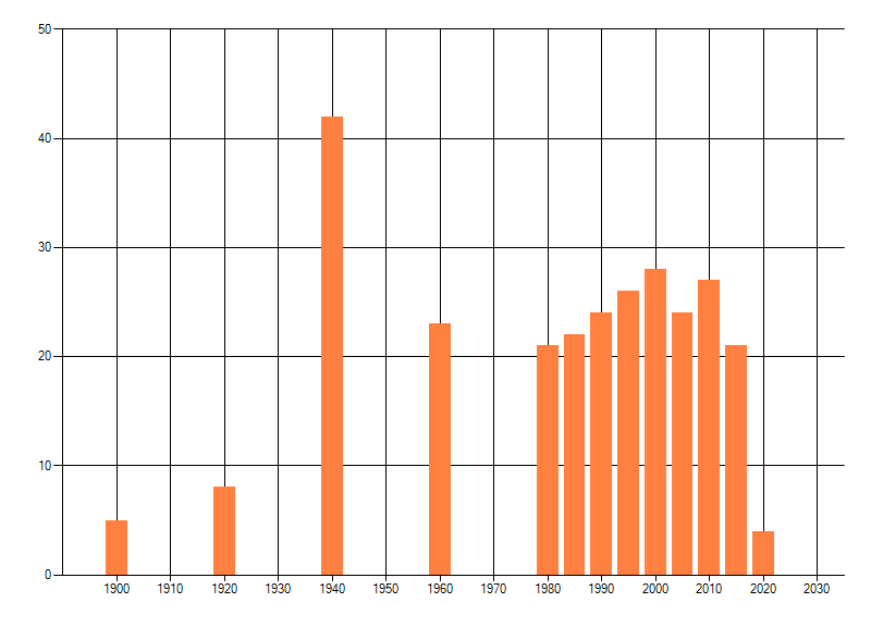 Het aantal atlasblokken (5x5 km) waarin de soort is gemeld binnen een periode van vijf jaar (vanaf 1980) of twintig jaar. Niet gecorrigeerd voor waarnemersinspanning en het aantal doorgegeven waarnemingen kan sterk variëren per periode, dus een trend in verspreiding kan hier niet direct uit worden afgelezen. Het opgegeven jaartal is het eerste jaar van de periode. Bron: gevalideerde waarnemingen uit de NDFF.