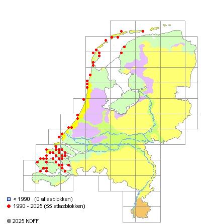 Het aantal atlasblokken (5x5 km) waarin de soort is gemeld binnen een periode van vijf jaar (vanaf 1980) of twintig jaar. Niet gecorrigeerd voor waarnemersinspanning en het aantal doorgegeven waarnemingen kan sterk variëren per periode, dus een trend in verspreiding kan hier niet direct uit worden afgelezen. Het opgegeven jaartal is het eerste jaar van de periode. Bron: gevalideerde waarnemingen uit de NDFF.