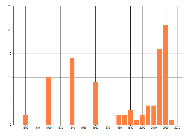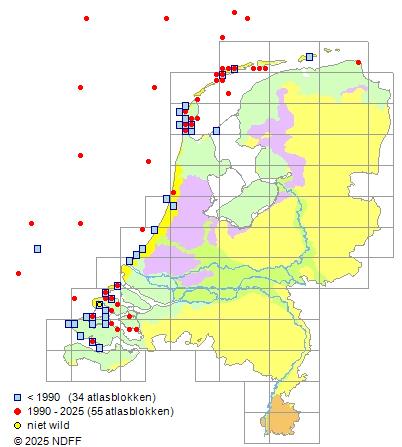 Het aantal atlasblokken (5x5 km) waarin de soort is gemeld binnen een periode van vijf jaar (vanaf 1980) of twintig jaar. Niet gecorrigeerd voor waarnemersinspanning en het aantal doorgegeven waarnemingen kan sterk variëren per periode, dus een trend in verspreiding kan hier niet direct uit worden afgelezen. Het opgegeven jaartal is het eerste jaar van de periode. Bron: gevalideerde waarnemingen uit de NDFF.