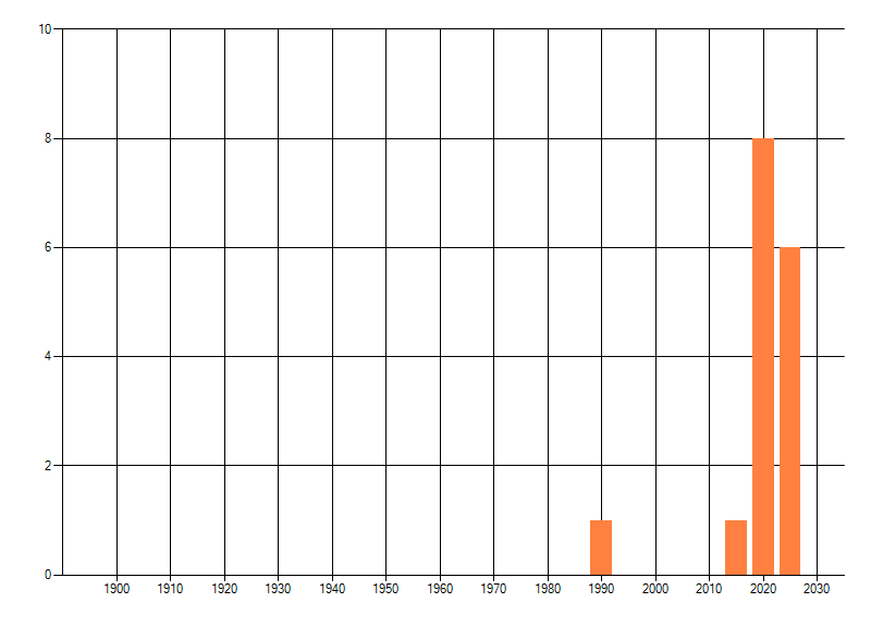 Het aantal atlasblokken (5x5 km) waarin de soort is gemeld binnen een periode van vijf jaar (vanaf 1980) of twintig jaar. Niet gecorrigeerd voor waarnemersinspanning en het aantal doorgegeven waarnemingen kan sterk variëren per periode, dus een trend in verspreiding kan hier niet direct uit worden afgelezen. Het opgegeven jaartal is het eerste jaar van de periode. Bron: gevalideerde waarnemingen uit de NDFF.