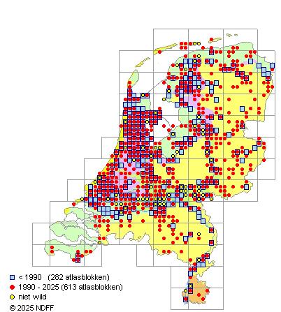 Het aantal atlasblokken (5x5 km) waarin de soort is gemeld binnen een periode van vijf jaar (vanaf 1980) of twintig jaar. Niet gecorrigeerd voor waarnemersinspanning en het aantal doorgegeven waarnemingen kan sterk variëren per periode, dus een trend in verspreiding kan hier niet direct uit worden afgelezen. Het opgegeven jaartal is het eerste jaar van de periode. Bron: gevalideerde waarnemingen uit de NDFF.