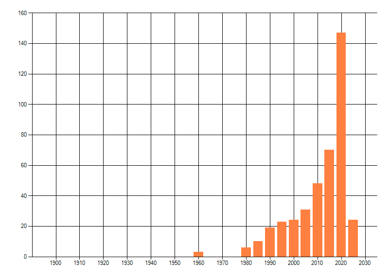 Het aantal atlasblokken (5x5 km) waarin de soort is gemeld binnen een periode van vijf jaar (vanaf 1980) of twintig jaar. Niet gecorrigeerd voor waarnemersinspanning en het aantal doorgegeven waarnemingen kan sterk variëren per periode, dus een trend in verspreiding kan hier niet direct uit worden afgelezen. Het opgegeven jaartal is het eerste jaar van de periode. Bron: gevalideerde waarnemingen uit de NDFF.