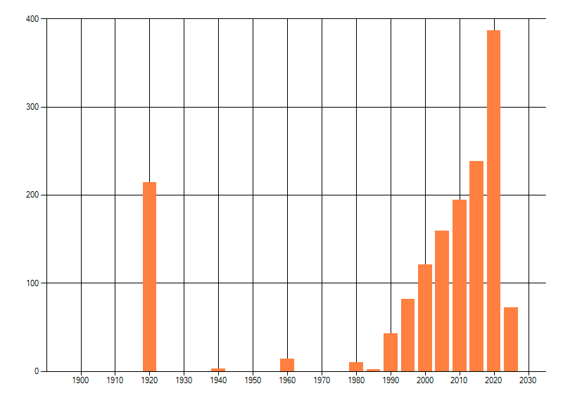 Het aantal atlasblokken (5x5 km) waarin de soort is gemeld binnen een periode van vijf jaar (vanaf 1980) of twintig jaar. Niet gecorrigeerd voor waarnemersinspanning en het aantal doorgegeven waarnemingen kan sterk variëren per periode, dus een trend in verspreiding kan hier niet direct uit worden afgelezen. Het opgegeven jaartal is het eerste jaar van de periode. Bron: gevalideerde waarnemingen uit de NDFF.