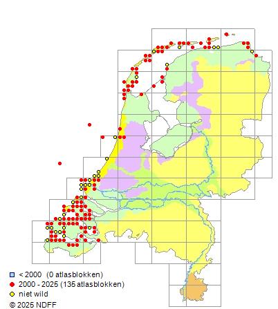 Het aantal atlasblokken (5x5 km) waarin de soort is gemeld binnen een periode van vijf jaar (vanaf 1980) of twintig jaar. Niet gecorrigeerd voor waarnemersinspanning en het aantal doorgegeven waarnemingen kan sterk variëren per periode, dus een trend in verspreiding kan hier niet direct uit worden afgelezen. Het opgegeven jaartal is het eerste jaar van de periode. Bron: gevalideerde waarnemingen uit de NDFF.