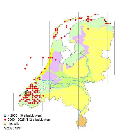 Het aantal atlasblokken (5x5 km) waarin de soort is gemeld binnen een periode van vijf jaar (vanaf 1980) of twintig jaar. Niet gecorrigeerd voor waarnemersinspanning en het aantal doorgegeven waarnemingen kan sterk variëren per periode, dus een trend in verspreiding kan hier niet direct uit worden afgelezen. Het opgegeven jaartal is het eerste jaar van de periode. Bron: gevalideerde waarnemingen uit de NDFF.