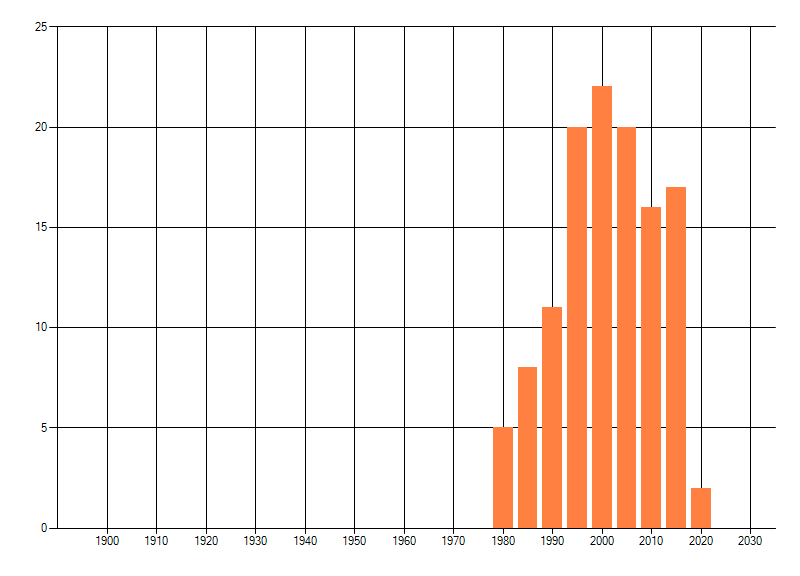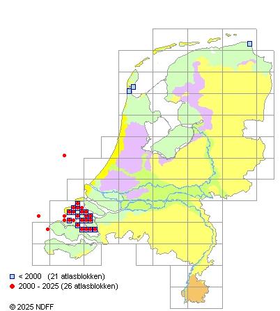 Het aantal atlasblokken (5x5 km) waarin de soort is gemeld binnen een periode van vijf jaar (vanaf 1980) of twintig jaar. Niet gecorrigeerd voor waarnemersinspanning en het aantal doorgegeven waarnemingen kan sterk variëren per periode, dus een trend in verspreiding kan hier niet direct uit worden afgelezen. Het opgegeven jaartal is het eerste jaar van de periode. Bron: gevalideerde waarnemingen uit de NDFF.