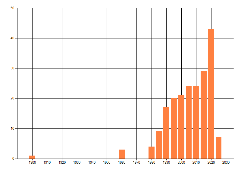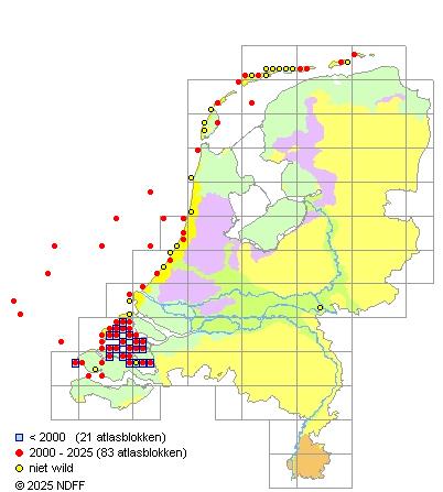 Het aantal atlasblokken (5x5 km) waarin de soort is gemeld binnen een periode van vijf jaar (vanaf 1980) of twintig jaar. Niet gecorrigeerd voor waarnemersinspanning en het aantal doorgegeven waarnemingen kan sterk variëren per periode, dus een trend in verspreiding kan hier niet direct uit worden afgelezen. Het opgegeven jaartal is het eerste jaar van de periode. Bron: gevalideerde waarnemingen uit de NDFF.