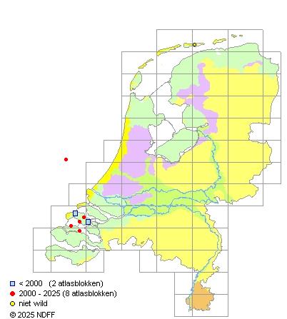 Het aantal atlasblokken (5x5 km) waarin de soort is gemeld binnen een periode van vijf jaar (vanaf 1980) of twintig jaar. Niet gecorrigeerd voor waarnemersinspanning en het aantal doorgegeven waarnemingen kan sterk variëren per periode, dus een trend in verspreiding kan hier niet direct uit worden afgelezen. Het opgegeven jaartal is het eerste jaar van de periode. Bron: gevalideerde waarnemingen uit de NDFF.