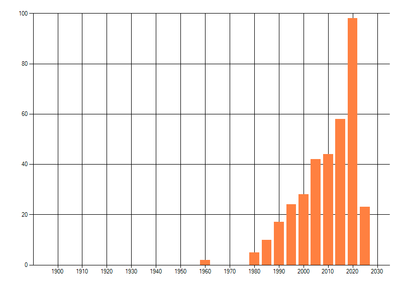Het aantal atlasblokken (5x5 km) waarin de soort is gemeld binnen een periode van vijf jaar (vanaf 1980) of twintig jaar. Niet gecorrigeerd voor waarnemersinspanning en het aantal doorgegeven waarnemingen kan sterk variëren per periode, dus een trend in verspreiding kan hier niet direct uit worden afgelezen. Het opgegeven jaartal is het eerste jaar van de periode. Bron: gevalideerde waarnemingen uit de NDFF.