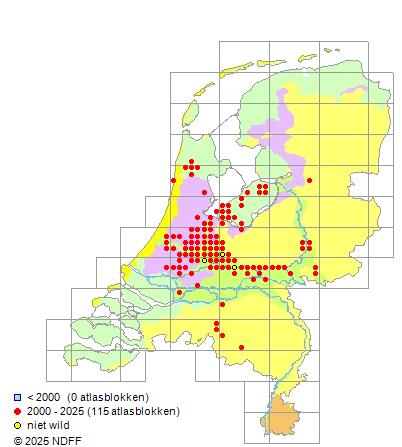 Het aantal atlasblokken (5x5 km) waarin de soort is gemeld binnen een periode van vijf jaar (vanaf 1980) of twintig jaar. Niet gecorrigeerd voor waarnemersinspanning en het aantal doorgegeven waarnemingen kan sterk variëren per periode, dus een trend in verspreiding kan hier niet direct uit worden afgelezen. Het opgegeven jaartal is het eerste jaar van de periode. Bron: gevalideerde waarnemingen uit de NDFF.