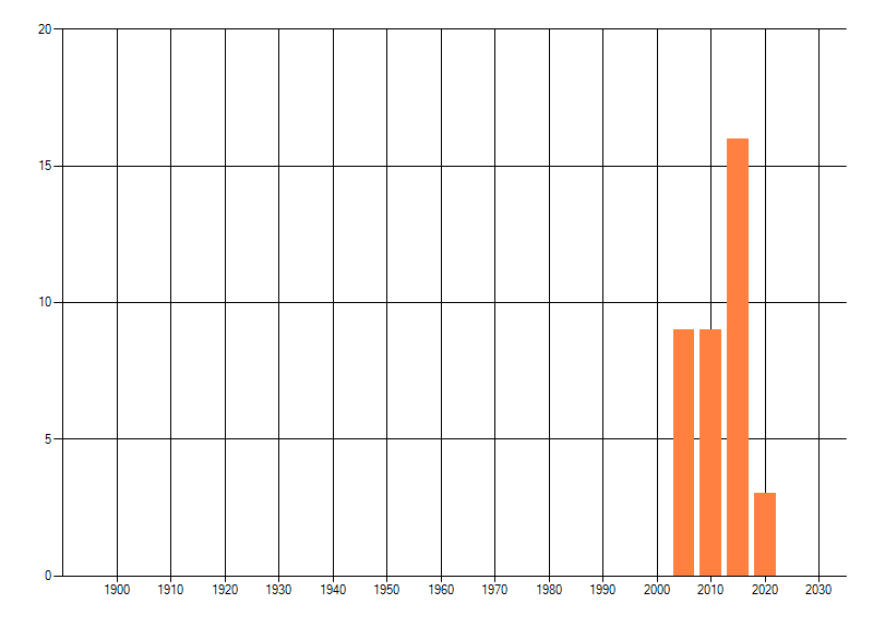 Het aantal atlasblokken (5x5 km) waarin de soort is gemeld binnen een periode van vijf jaar (vanaf 1980) of twintig jaar. Niet gecorrigeerd voor waarnemersinspanning en het aantal doorgegeven waarnemingen kan sterk variëren per periode, dus een trend in verspreiding kan hier niet direct uit worden afgelezen. Het opgegeven jaartal is het eerste jaar van de periode. Bron: gevalideerde waarnemingen uit de NDFF.