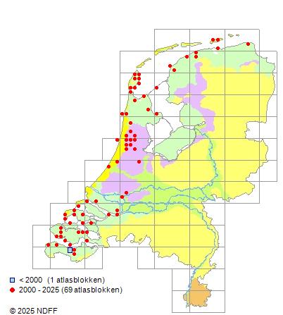 Het aantal atlasblokken (5x5 km) waarin de soort is gemeld binnen een periode van vijf jaar (vanaf 1980) of twintig jaar. Niet gecorrigeerd voor waarnemersinspanning en het aantal doorgegeven waarnemingen kan sterk variëren per periode, dus een trend in verspreiding kan hier niet direct uit worden afgelezen. Het opgegeven jaartal is het eerste jaar van de periode. Bron: gevalideerde waarnemingen uit de NDFF.