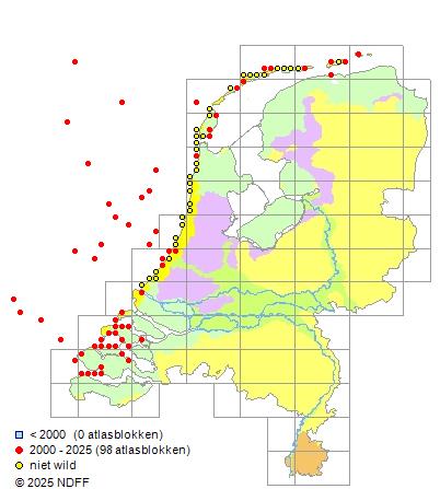 Het aantal atlasblokken (5x5 km) waarin de soort is gemeld binnen een periode van vijf jaar (vanaf 1980) of twintig jaar. Niet gecorrigeerd voor waarnemersinspanning en het aantal doorgegeven waarnemingen kan sterk variëren per periode, dus een trend in verspreiding kan hier niet direct uit worden afgelezen. Het opgegeven jaartal is het eerste jaar van de periode. Bron: gevalideerde waarnemingen uit de NDFF.
