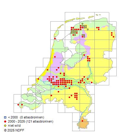 Het aantal atlasblokken (5x5 km) waarin de soort is gemeld binnen een periode van vijf jaar (vanaf 1980) of twintig jaar. Niet gecorrigeerd voor waarnemersinspanning en het aantal doorgegeven waarnemingen kan sterk variëren per periode, dus een trend in verspreiding kan hier niet direct uit worden afgelezen. Het opgegeven jaartal is het eerste jaar van de periode. Bron: gevalideerde waarnemingen uit de NDFF.
