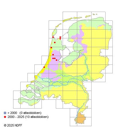 Het aantal atlasblokken (5x5 km) waarin de soort is gemeld binnen een periode van vijf jaar (vanaf 1980) of twintig jaar. Niet gecorrigeerd voor waarnemersinspanning en het aantal doorgegeven waarnemingen kan sterk variëren per periode, dus een trend in verspreiding kan hier niet direct uit worden afgelezen. Het opgegeven jaartal is het eerste jaar van de periode. Bron: gevalideerde waarnemingen uit de NDFF.