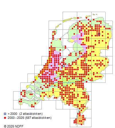 Het aantal atlasblokken (5x5 km) waarin de soort is gemeld binnen een periode van vijf jaar (vanaf 1980) of twintig jaar. Niet gecorrigeerd voor waarnemersinspanning en het aantal doorgegeven waarnemingen kan sterk variëren per periode, dus een trend in verspreiding kan hier niet direct uit worden afgelezen. Het opgegeven jaartal is het eerste jaar van de periode. Bron: gevalideerde waarnemingen uit de NDFF.