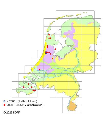 Het aantal atlasblokken (5x5 km) waarin de soort is gemeld binnen een periode van vijf jaar (vanaf 1980) of twintig jaar. Niet gecorrigeerd voor waarnemersinspanning en het aantal doorgegeven waarnemingen kan sterk variëren per periode, dus een trend in verspreiding kan hier niet direct uit worden afgelezen. Het opgegeven jaartal is het eerste jaar van de periode. Bron: gevalideerde waarnemingen uit de NDFF.