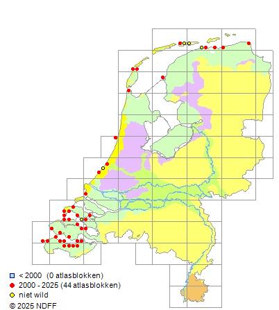 Het aantal atlasblokken (5x5 km) waarin de soort is gemeld binnen een periode van vijf jaar (vanaf 1980) of twintig jaar. Niet gecorrigeerd voor waarnemersinspanning en het aantal doorgegeven waarnemingen kan sterk variëren per periode, dus een trend in verspreiding kan hier niet direct uit worden afgelezen. Het opgegeven jaartal is het eerste jaar van de periode. Bron: gevalideerde waarnemingen uit de NDFF.