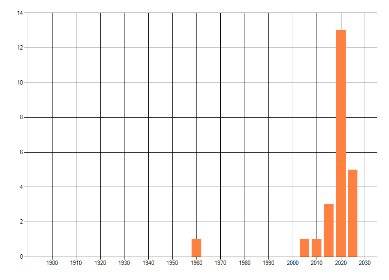 Het aantal atlasblokken (5x5 km) waarin de soort is gemeld binnen een periode van vijf jaar (vanaf 1980) of twintig jaar. Niet gecorrigeerd voor waarnemersinspanning en het aantal doorgegeven waarnemingen kan sterk variëren per periode, dus een trend in verspreiding kan hier niet direct uit worden afgelezen. Het opgegeven jaartal is het eerste jaar van de periode. Bron: gevalideerde waarnemingen uit de NDFF.